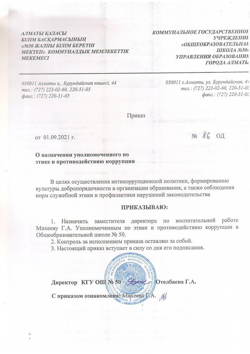 01 қыркүйек 2021 0 1 2 3 4 5 Әдеп және сыбайлас жемқорлыққа қарсы іс-қимыл жөніндегі уәкілдің бұйрығы. Приказ уполномоченного по этике и антикоррупции