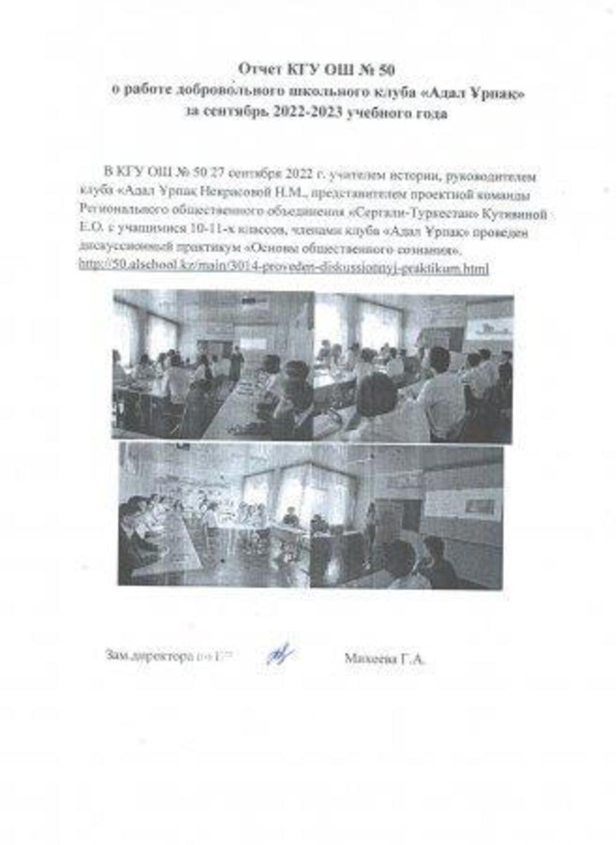 » «Адал ұрпақ» ерікті мектеп клубының 2022 жылдың қыркүйек айына есебі