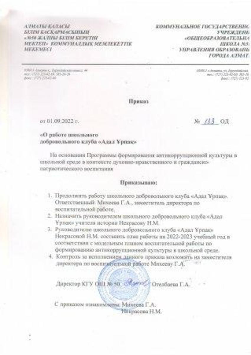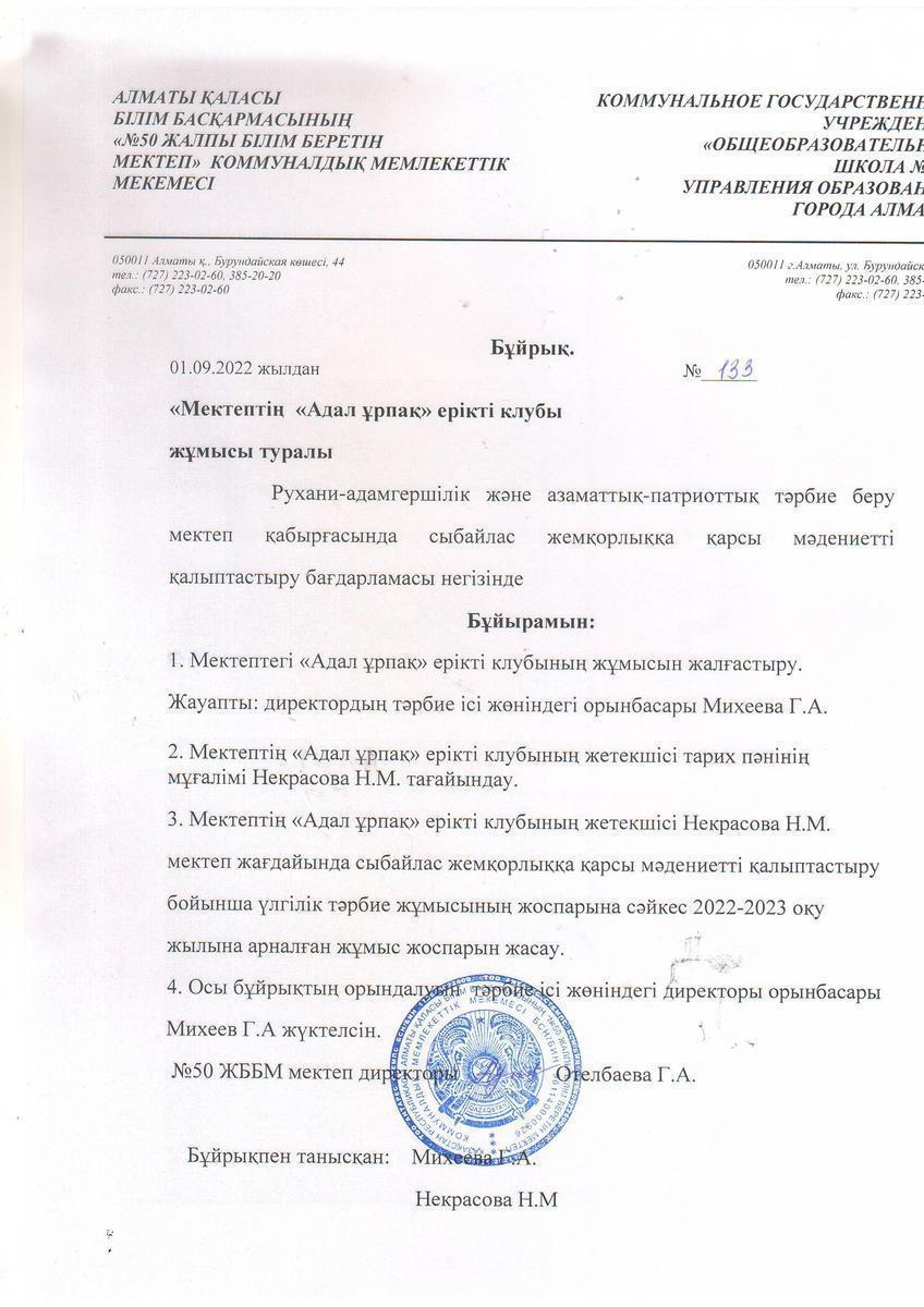 » «Адал ұрпақ» ерікті мектеп клубының жұмысы туралы бұйрық