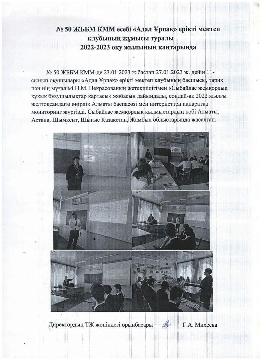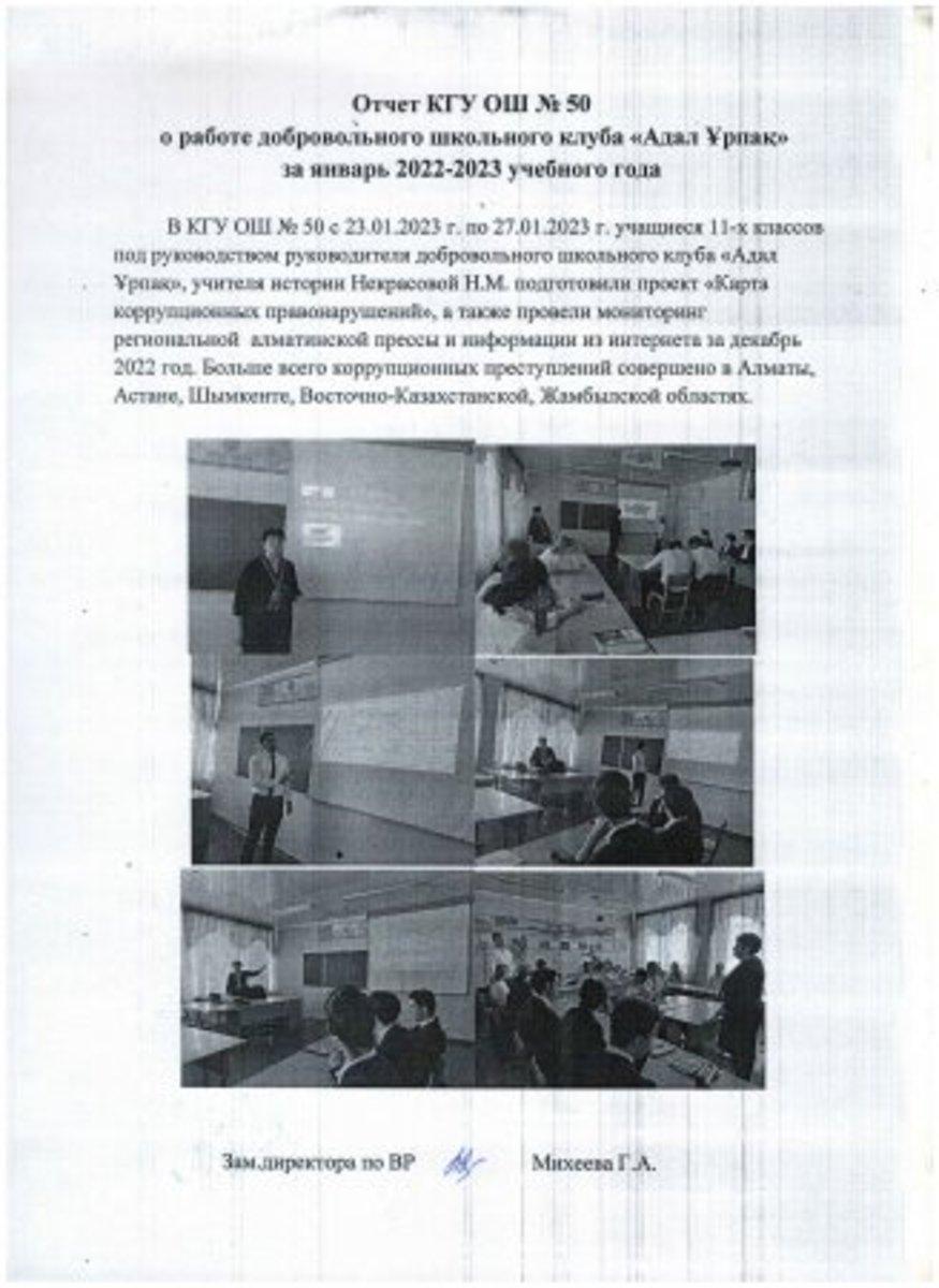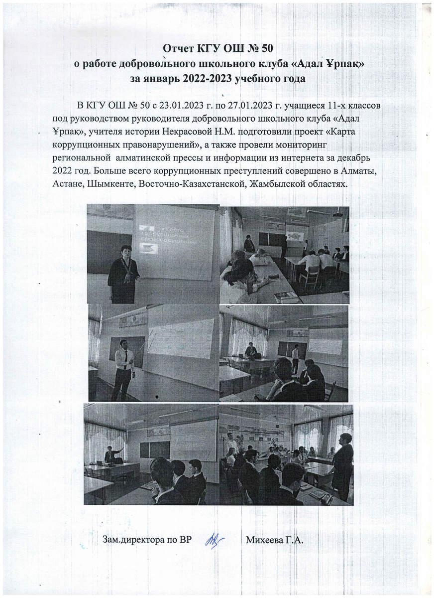 » «Адал ұрпақ» ерікті мектеп клубының 2023 жылдың қантар айына есебі