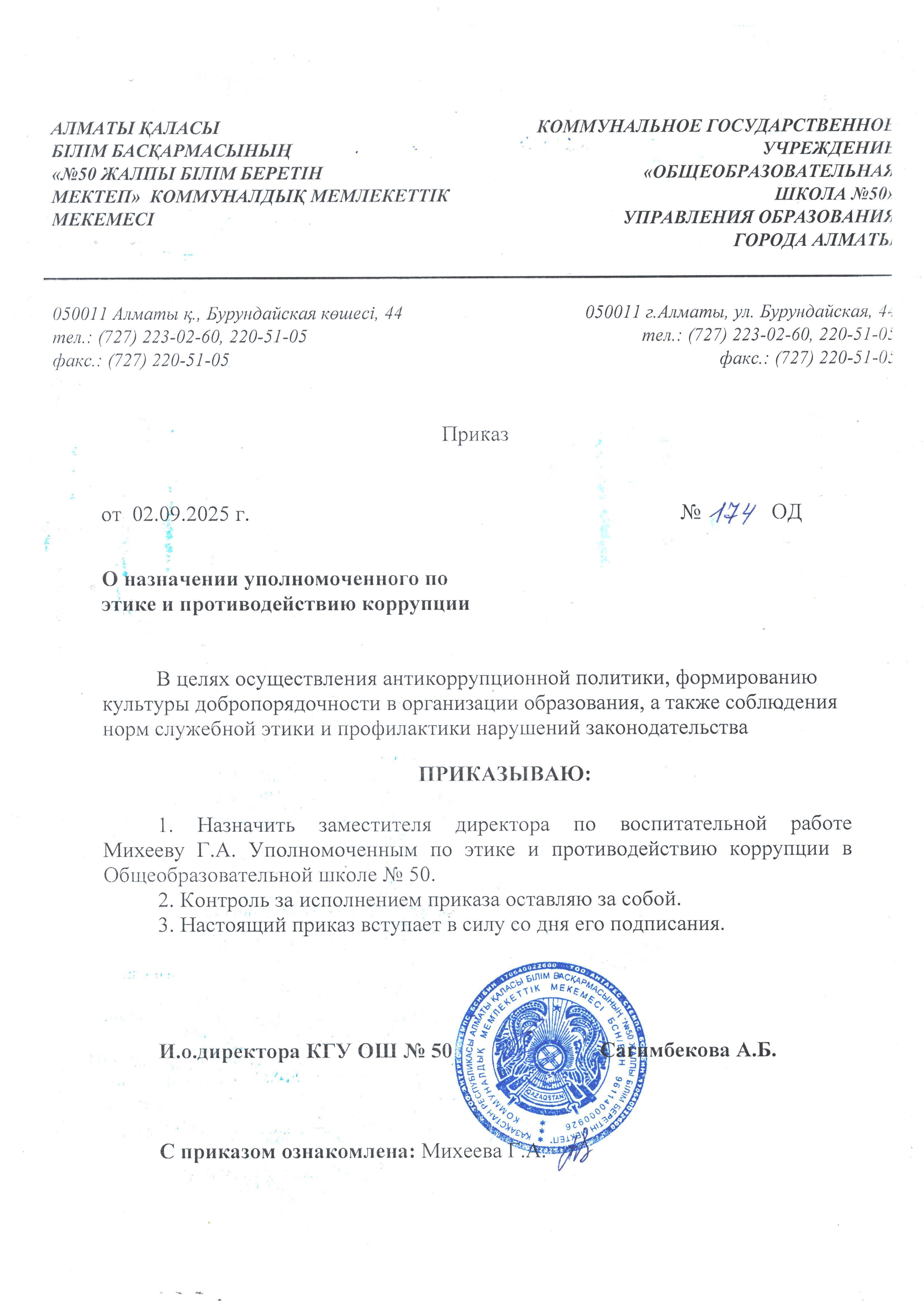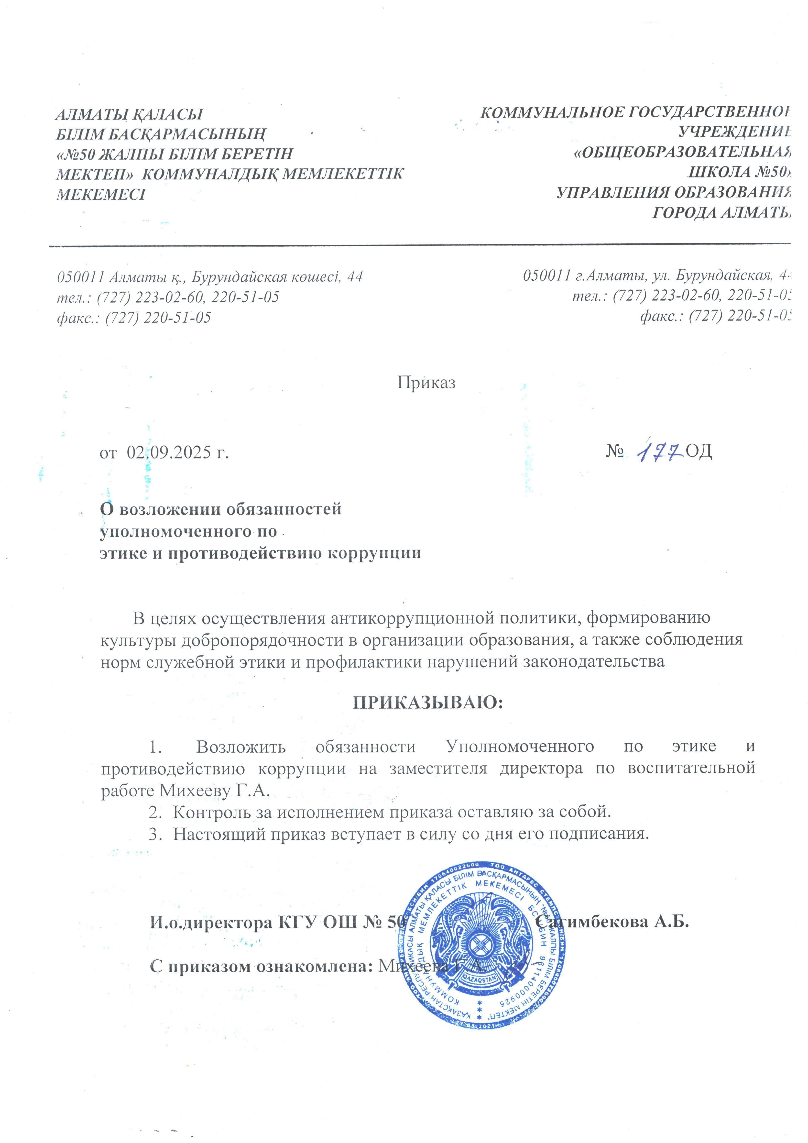 Әдеп және сыбайлас жемқорлыққа қарсы іс-қимыл жөніндегі уәкілді тағайындау туралы.О назначении уполномоченного по этике и противодействию коррупции.