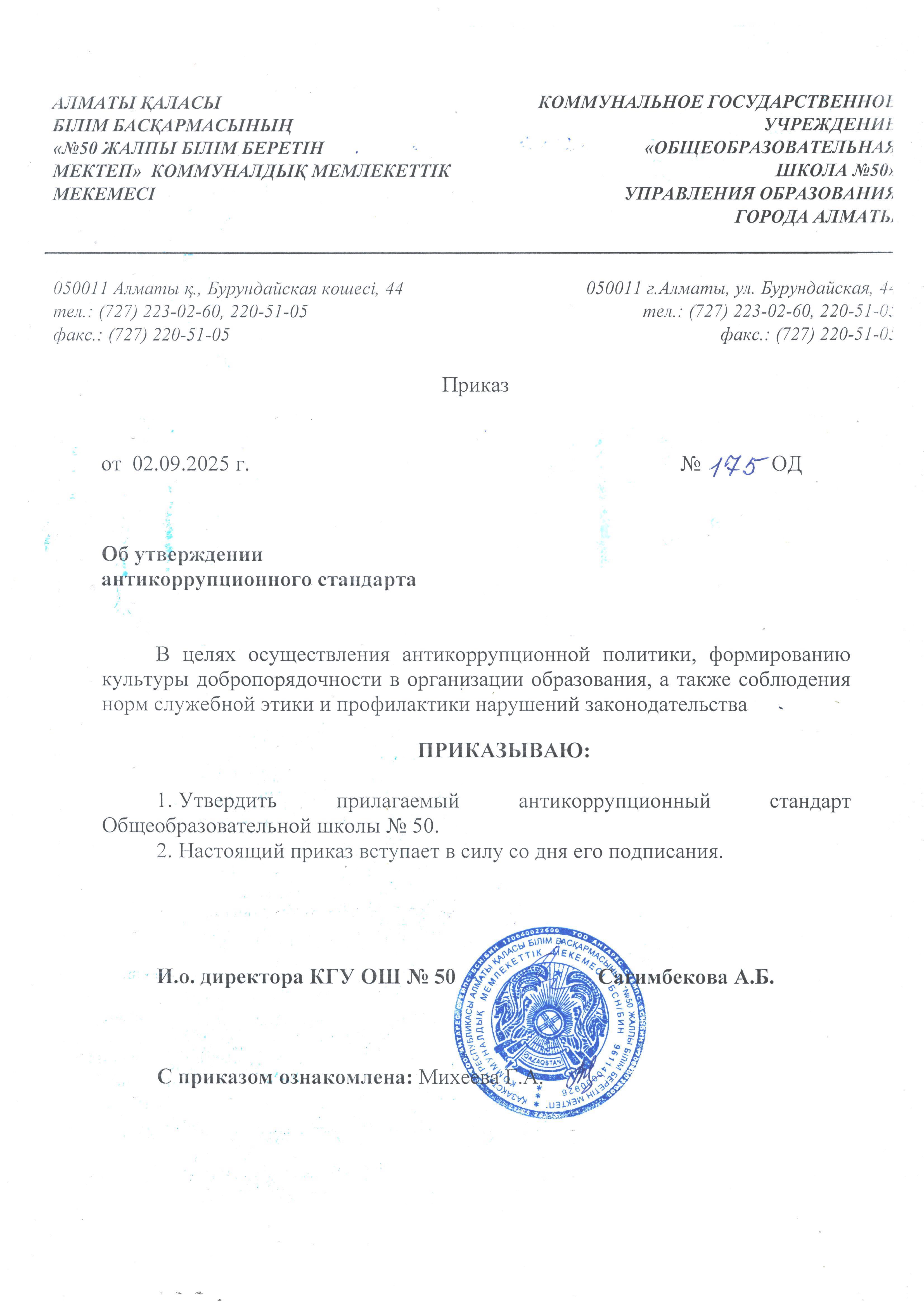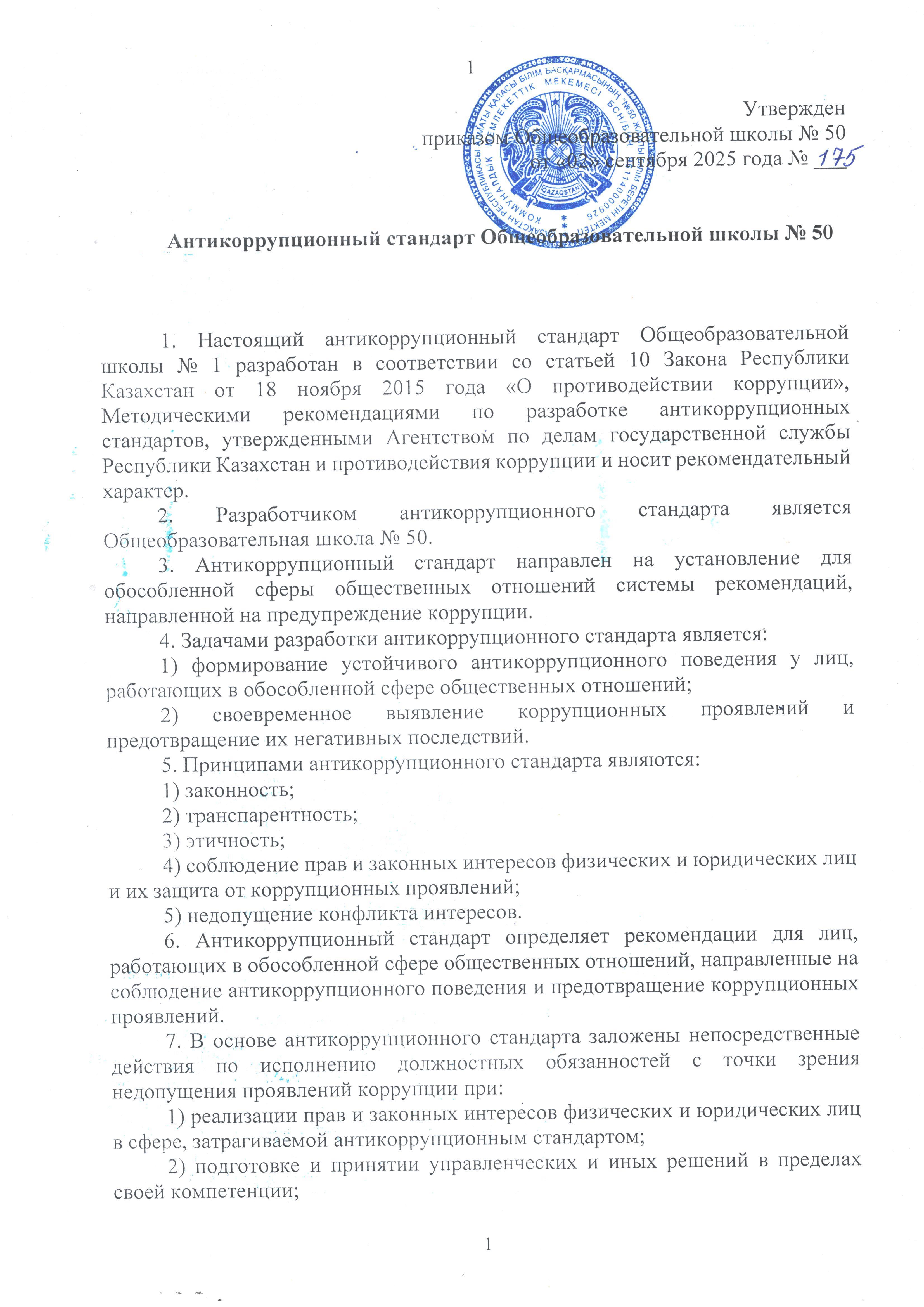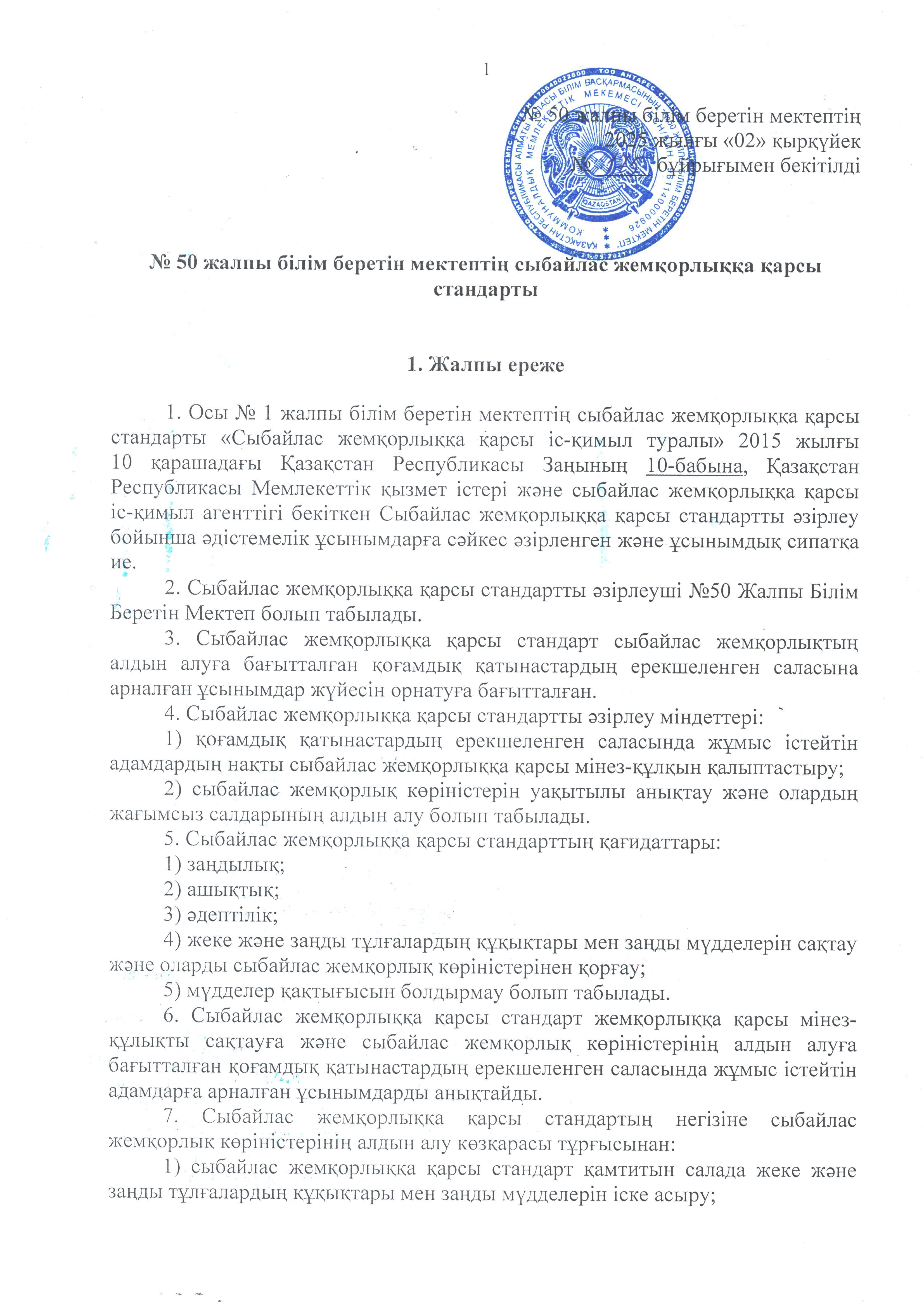 №50 жалпы білім беретін мектептің сыбайлас жемқорлыққа қарсы стандарты.Антикоррупционный стандарт Общеобразовательной школы №50