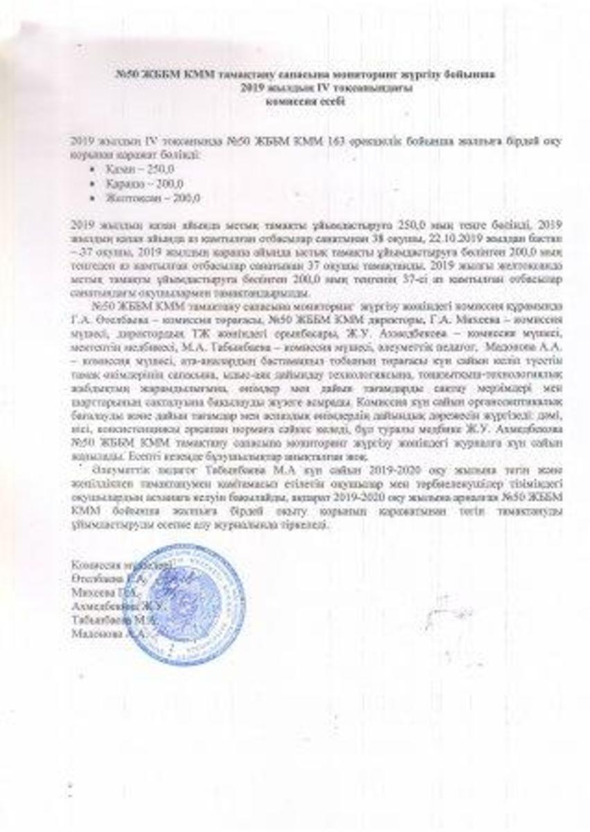 11 желтоқсан 2019 0 1 2 3 4 5 Отчет комиссии по мониторингу за качеством питания за IV квартал 2019г.