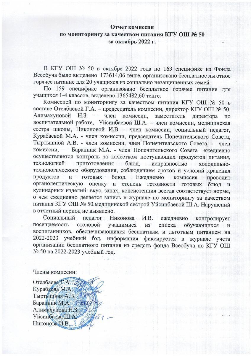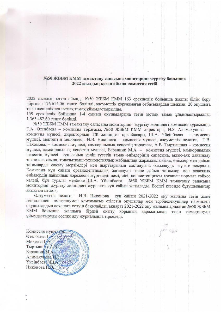 Тамақтану мониторингі жөніндегі комиссияның 2022 жылғы қазандағы есебі