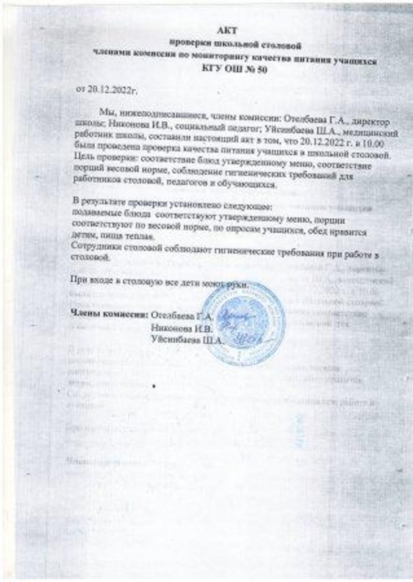 » Мектеп асханасын тексеру актісі. Акт проверки школьной столовой