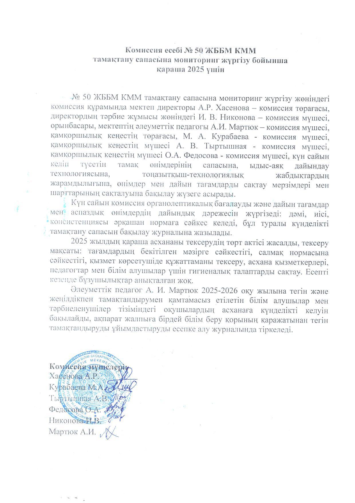 28 қараша 2025 0 1 2 3 4 5 Комиссия есебі №50 ЖББМ КММ тамақтану сапасына мониторингі. Отчет комисси по мониторингу за качеством питания КГУ ОШ №50