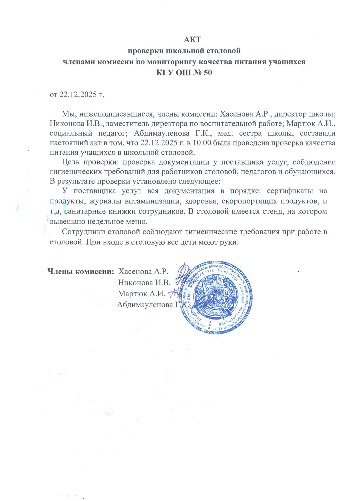 » Мектеп асханасын тексеру актісі. Акт проверки школьной столовой