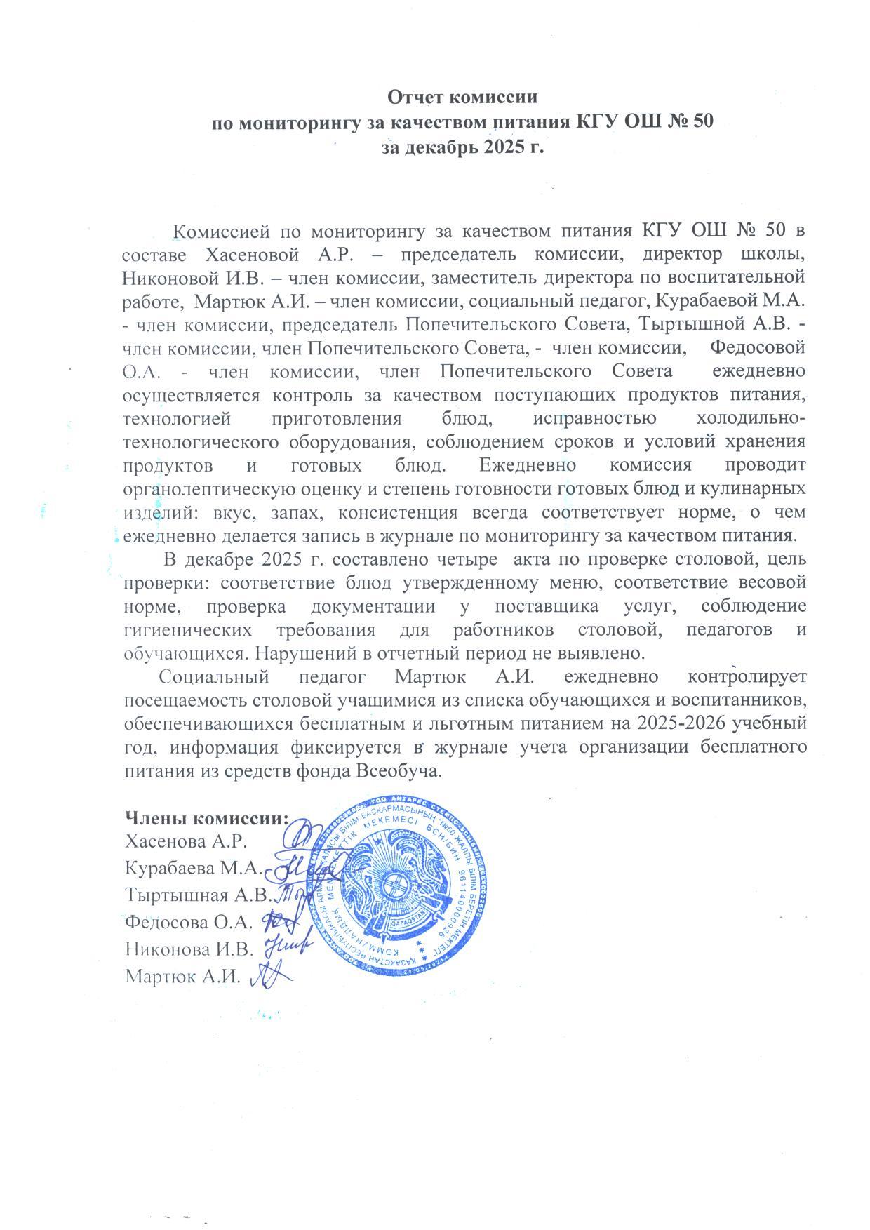 30 желтоқсан 2025 0 1 2 3 4 5 Желтоқсан айындағы тамақтану мониторингі бойынша №50 ЖББМ КММ комиссиясының есебі.Отчет комисии КГУ ОШ №50 по мониторингу питания за декабрь
